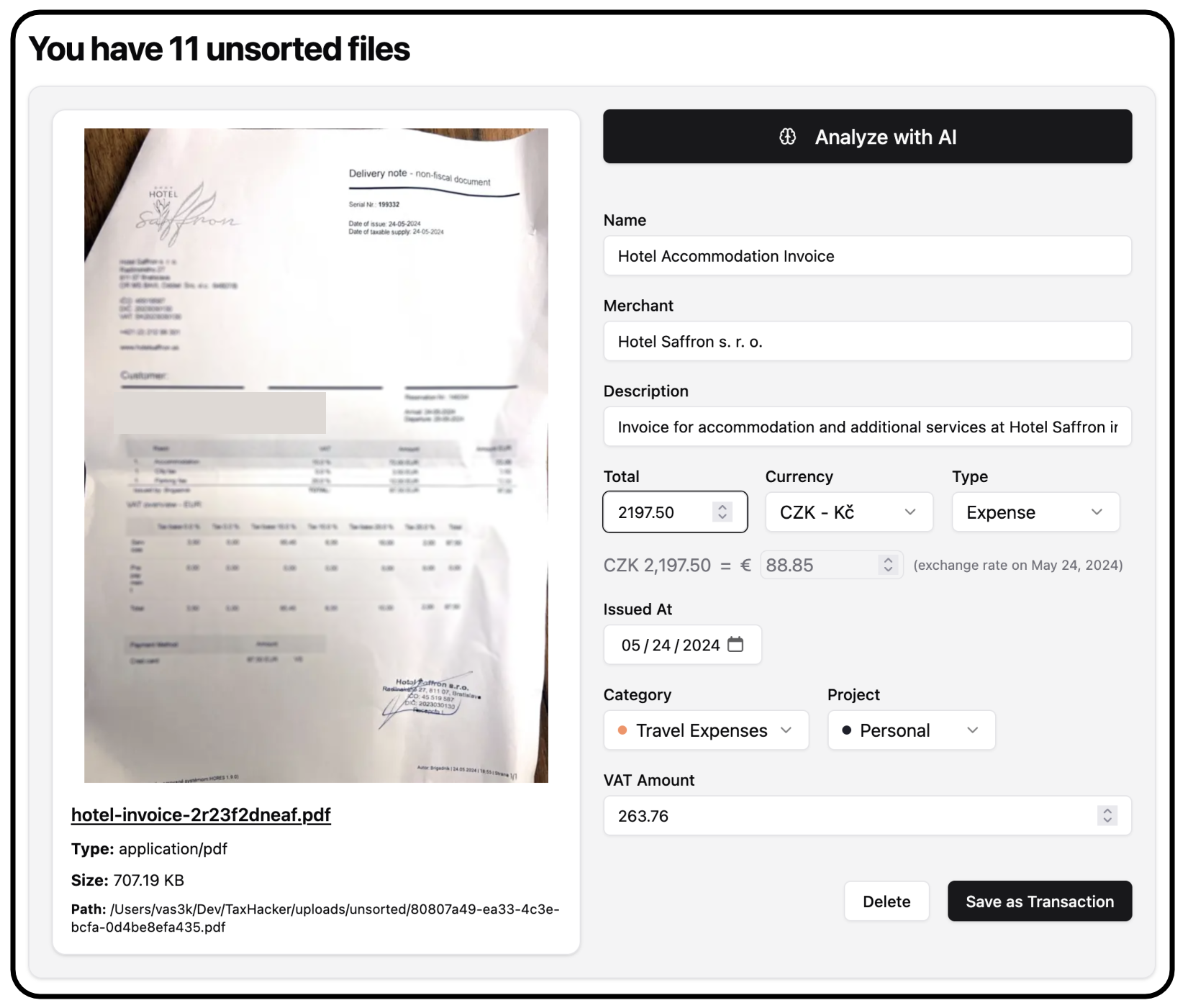 feat: filters, settings, backups fix: ts compile errors feat: new dashboard, webp previews and settings feat: use webp for pdfs feat: use webp fix: analyze resets old data fix: switch to corsproxy fix: switch to free cors fix: max upload limit fix: currency conversion feat: transaction export fix: currency conversion feat: refactor settings actions feat: new loader feat: README + LICENSE doc: update readme doc: update readme doc: update readme doc: update screenshots ci: bump prisma
